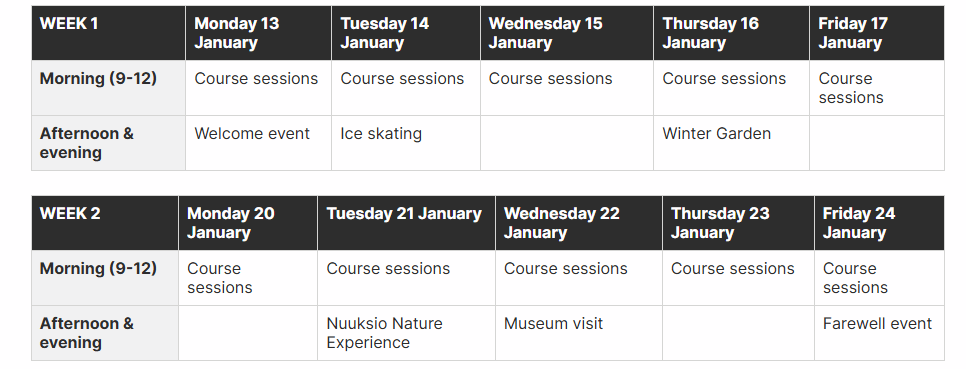 在这里,将由阿尔托大学充满热情的讲师与专家指导,通过实践学习和创新方法,深入探索学术世界。每门课程都配备了丰富的社交活动,让来自冬季学校各个课程的参与者能够在轻松愉悦的氛围中轻松交流、建立联系。通过各类社交活动和课外远足,参与者将有机会亲身体验芬兰的文化、自然与历史,深入了解这片土地的独特魅力。
