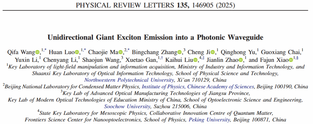 赵建林教授团队联合北京大学刘开辉教授、中国科学院物理研究所马超杰副研究员和苏州大学张丙昌、王绍军教授,在物理学领域顶级期刊《Physical Review Letters》上发表了题为“Unidirectional Giant Exciton Emission into a Photonic Waveguide”的研究论文。威尼斯人赌场